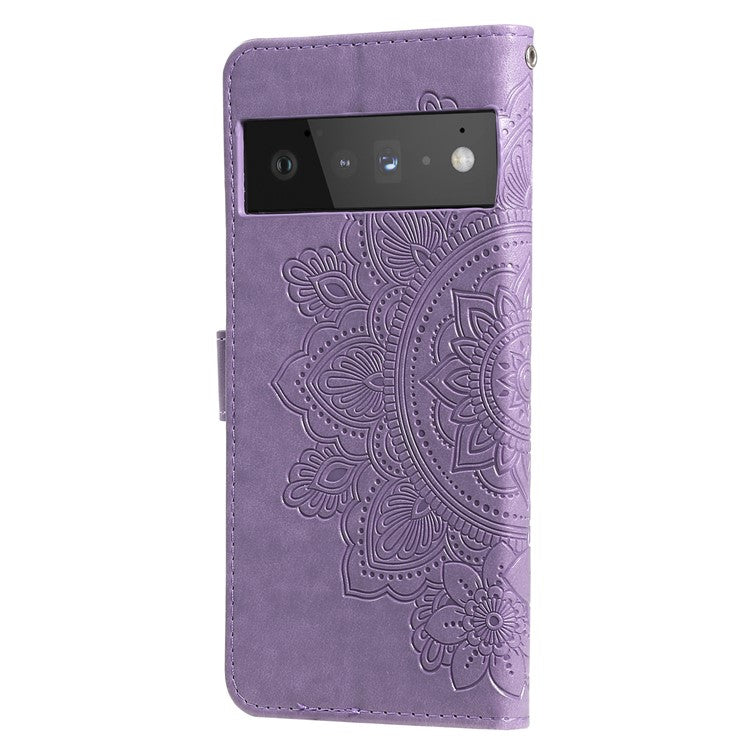 TPU+PU Leather Phone Case Stand Practical Flip Shell Card Slots Imprinted Flower Pattern Wallet Cover with Lanyard for Google Pixel 6 Pro - Light Purple