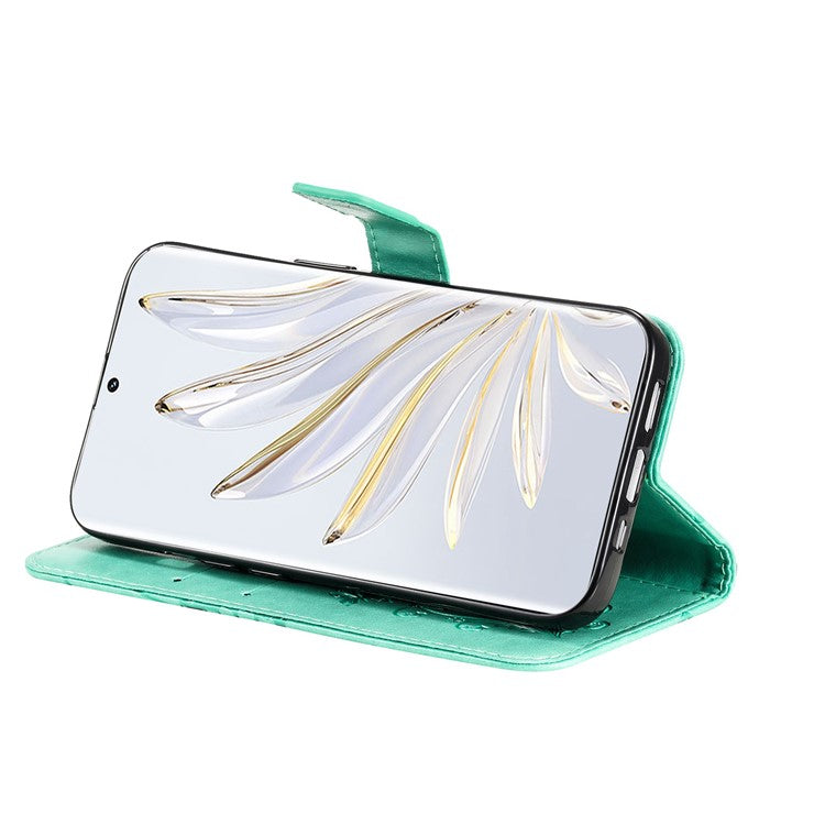 KT Imprinting Flower Series-2 for Honor 70 5G Magnetic Clasp PU Leather Mobile Phone Case Imprinted Butterfly Pattern Stand Wallet Cover - Green