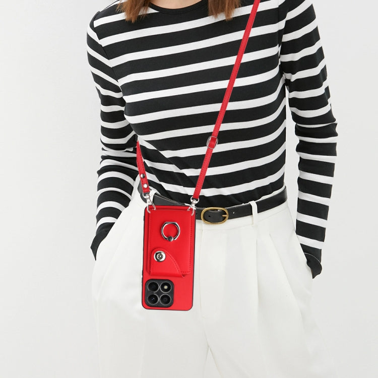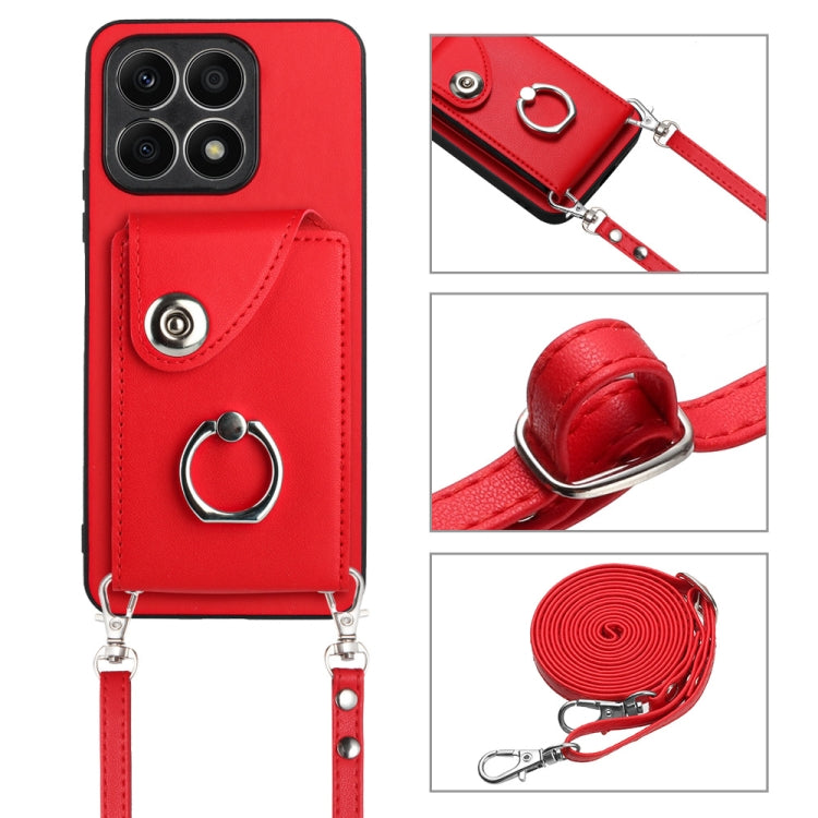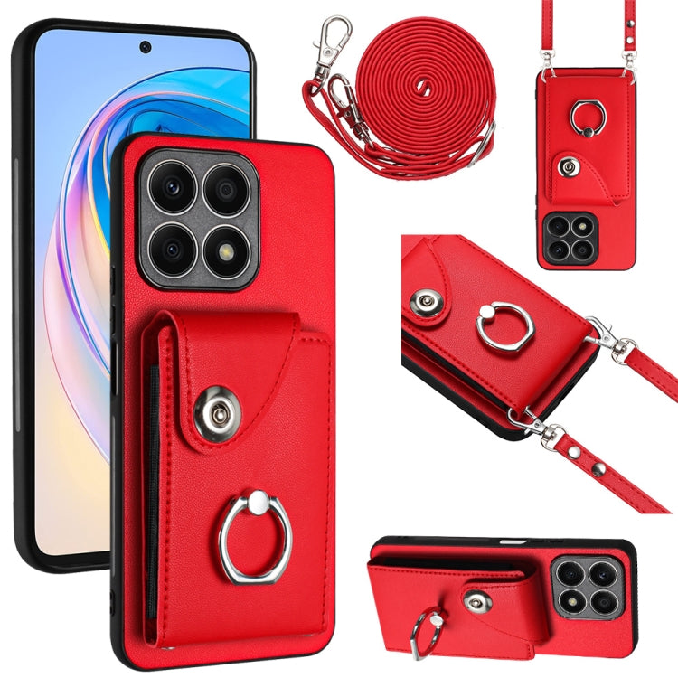 For Honor X8a Organ Card Bag Ring Holder Phone Case with Long Lanyard(Red)