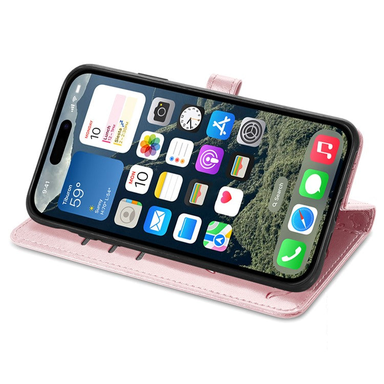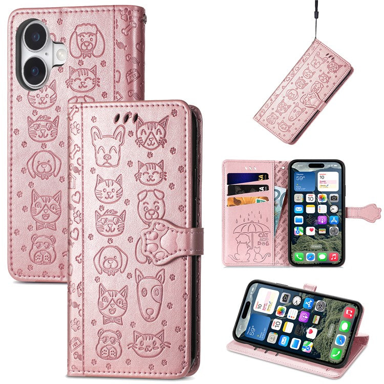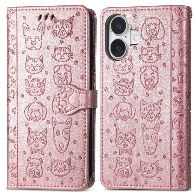 For iPhone 16 Case Leather Wallet Flip Phone Cover Cute Cat Dog Pattern - Rose Gold