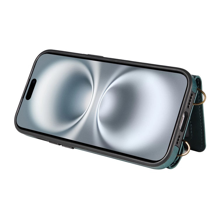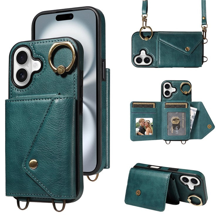 For iPhone 16 Plus Case Card Holder Leather + TPU Phone Cover with Long Shoulder Strap - Green