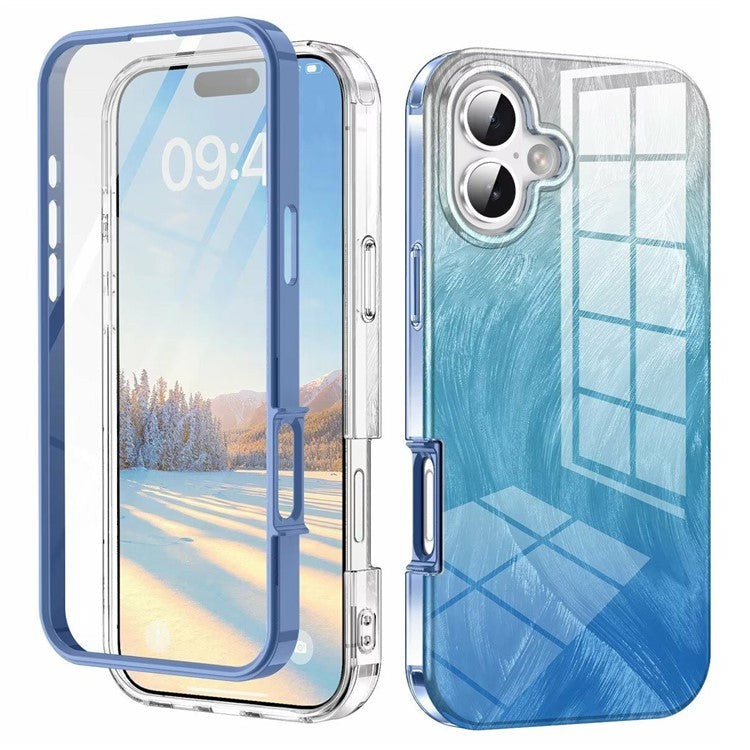 For iPhone 16 Plus Case Gradient Feather Pattern PC+TPU Phone Cover Built-In PET Screen Film - Blue