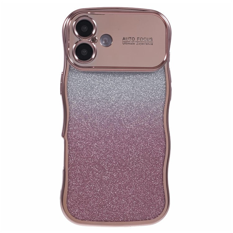 For iPhone 16 Plus Case Gradient Glitter TPU Phone Cover with Electroplating Curly Frame - Rose Pink