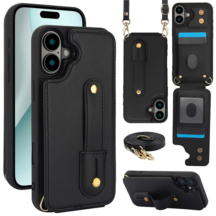 For iPhone 16 Plus Case Kickstand Card Slots Leather Coated TPU Cover with Shoulder Strap - Black