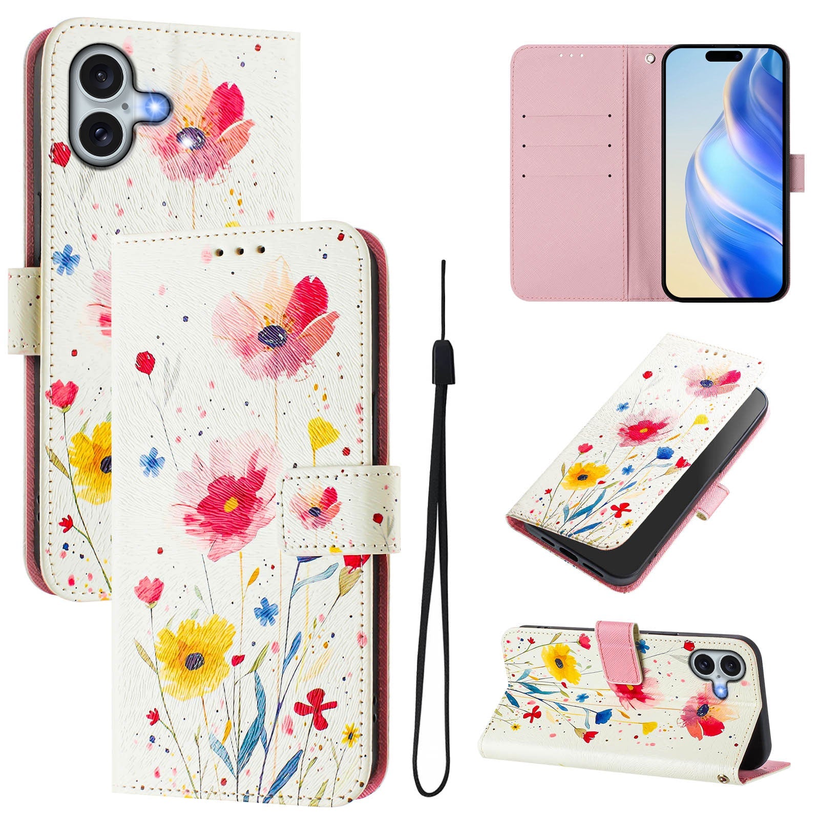 For iPhone 16 Plus Case Pattern Printing Wallet Phone Cover with Strap - Flower