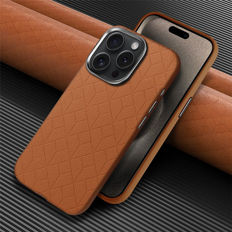 For iPhone 16 Pro Case Imprinted Anti-Fingerprint PU+TPU Phone Cover with Metal Buttons - Brown