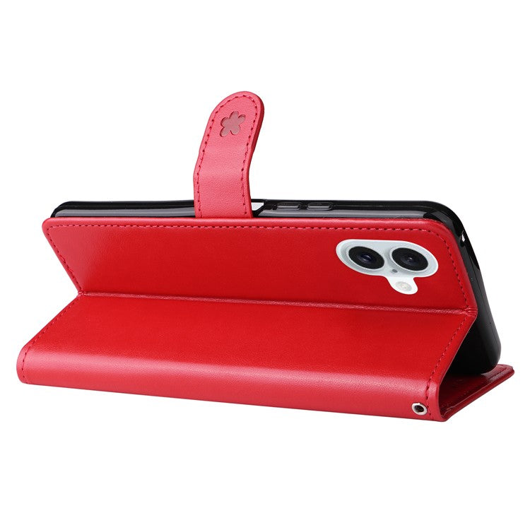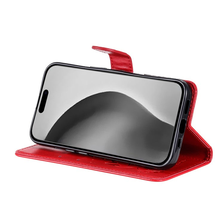 KT Imprinting Flower Series-4 For iPhone 16 Plus Case with Strap Cat Bee Pattern Leather Cover - Red
