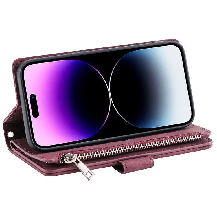 Style 005 For iPhone 16 Plus Case Rhombus Stitching Line PU Leather Zipper Wallet Phone Cover - Wine Red