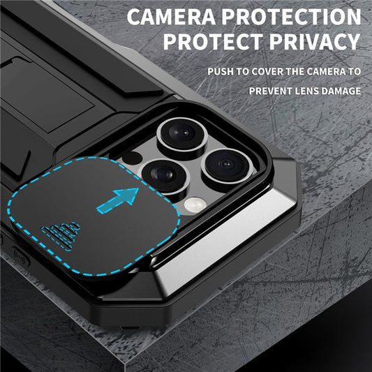 R-JUST For iPhone 16 Pro Case PC+Silicone+Metal Kickstand Phone Cover with Tempered Glass Film - Red