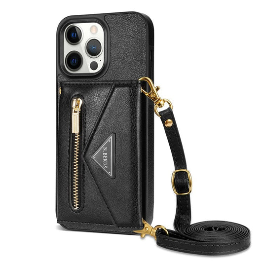 N.BEKUS For iPhone 16 Pro Case Card Slot Zipper Wallet Leather Phone Cover with Shoulder Strap - Red