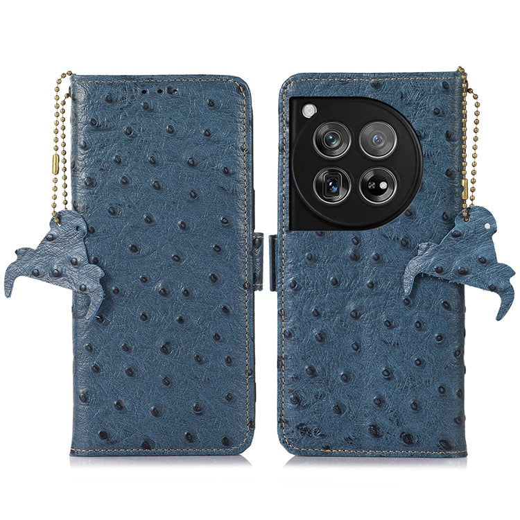 For OnePlus 12 5G Ostrich Pattern Phone Case Genuine Cow Leather Wallet - Blue