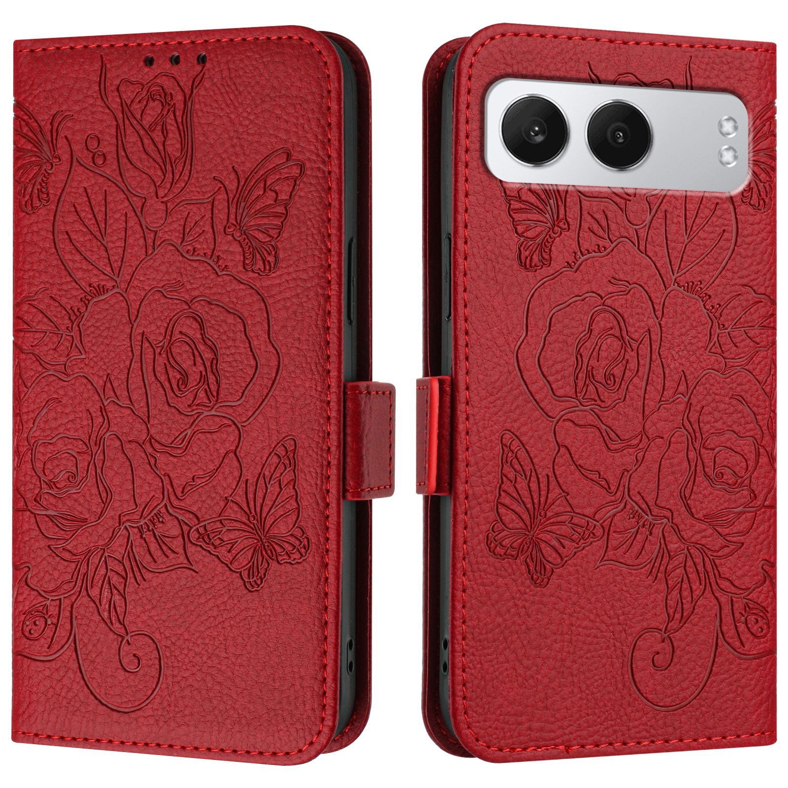 For OnePlus Nord 4 Case Rose Imprinted RFID Blocking Leather Phone Cover with Strap - Red