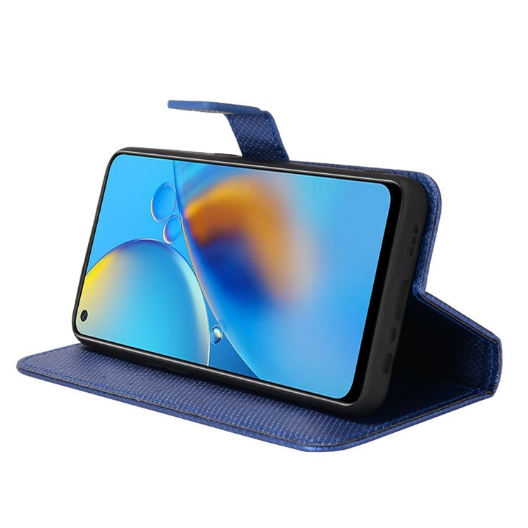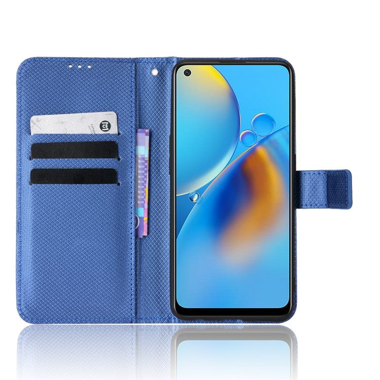 For Oppo A74 4G/Oppo F19 PU Leather Phone Case Wallet Stand Cover Anti-scratch Diamond Texture Phone Cover with Strap - Blue