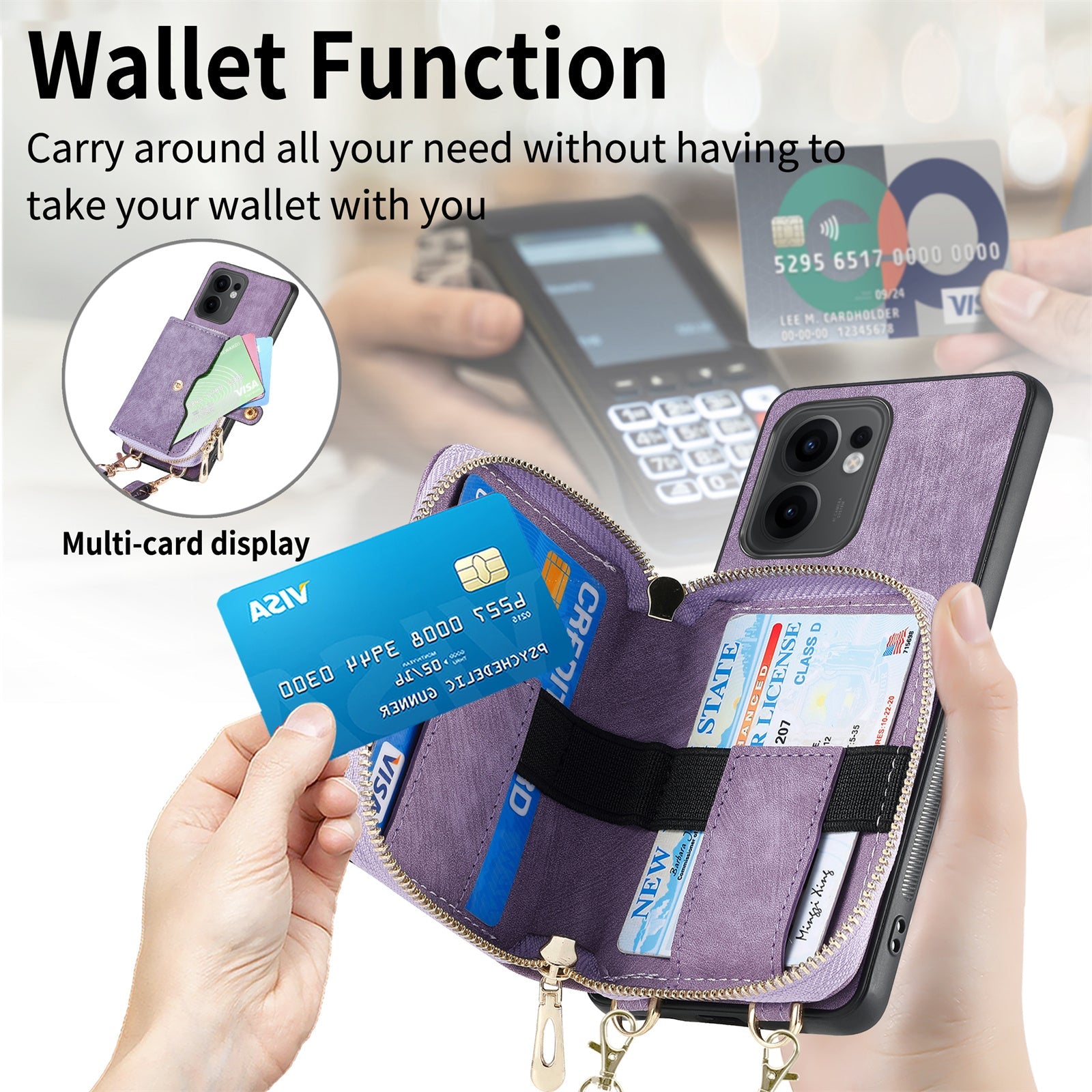 For Oppo Reno13 F 5G PU Leather Phone Back Cover with Zipper Card Holder and Long Strap - Purple