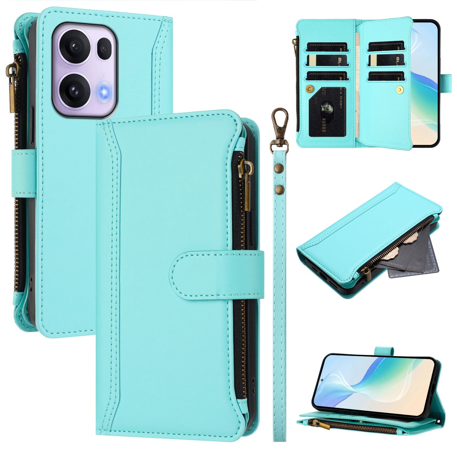 For Oppo Reno13 Pro 5G Leather Case 9 Card Slots Zipper Wallet Stand Phone Cover with Wrist Strap - Mint Green