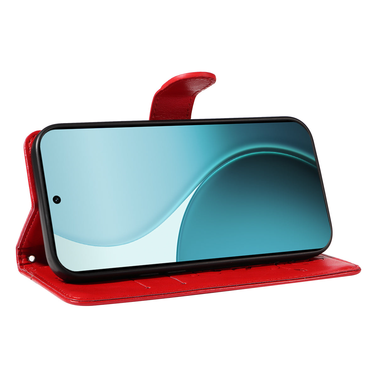 For Oppo Reno14 Pro 5G (China) / Oppo Reno14 Pro 5G (Global) PU Leather Cases Flower Pattern Wallet Stand Phone Cover with Strap - Red