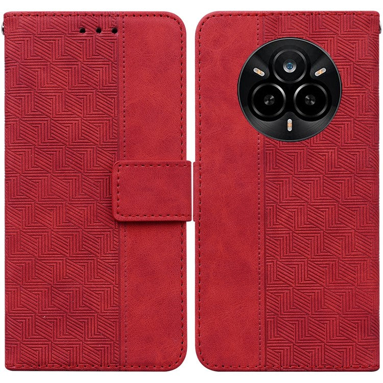 For Realme 14 Pro 5G Case Geometry Pattern Leather Wallet Phone Cover with Wrist Strap - Red