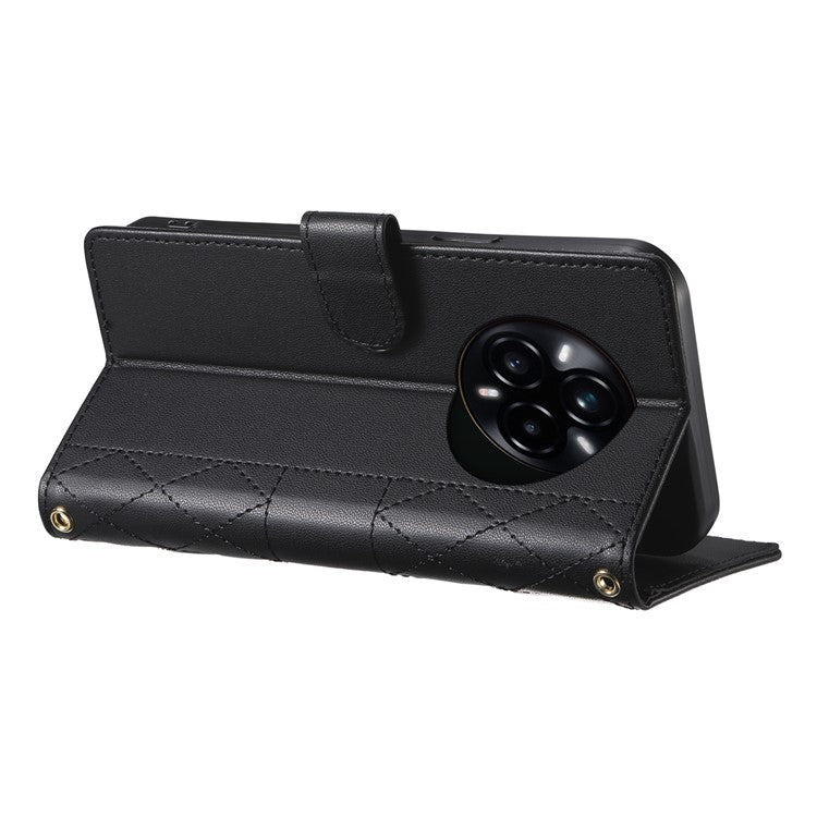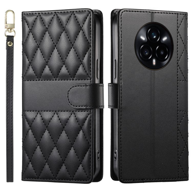 For Realme 14 Pro 5G Case Rhombus Stitching Wallet Stand Leather Phone Cover with Long / Short Strap - Black