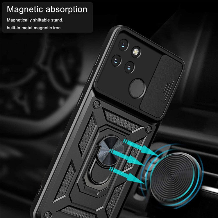 Anti-fall Phone Case Camera Slide Cover PC + TPU Hybrid Protective Shell with Ring Kickstand for Realme C21Y - Red