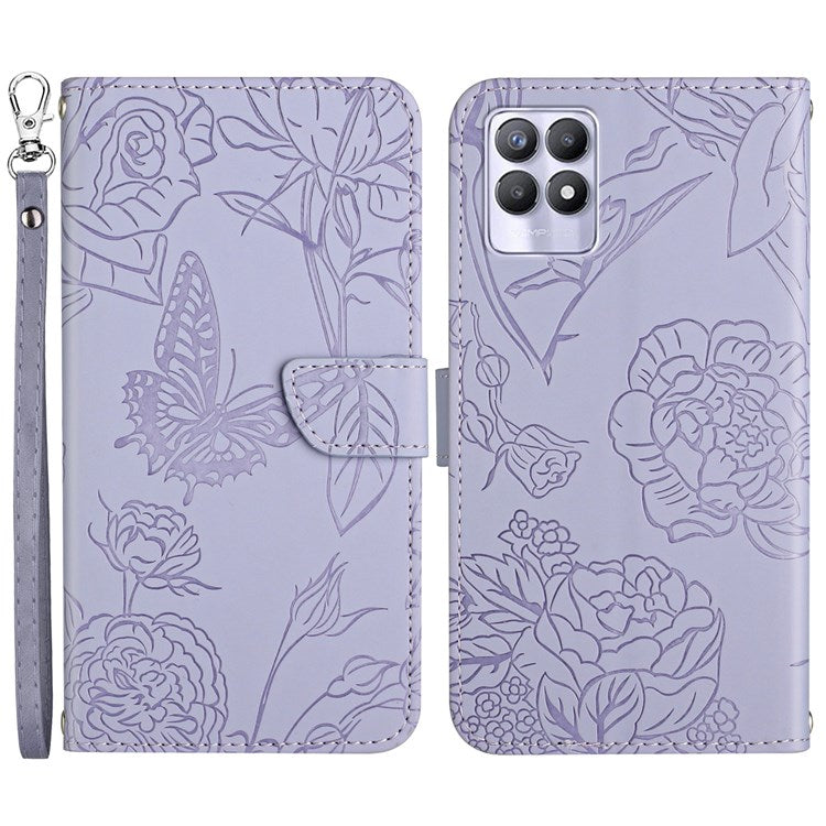 Butterfly Flowers Imprinting PU Leather Phone Shell for Realme 8i/Narzo 50 4G, Folio Flip Wallet Skin-Touch Leather Case with Foldable Stand Handy Strap - Light Purple