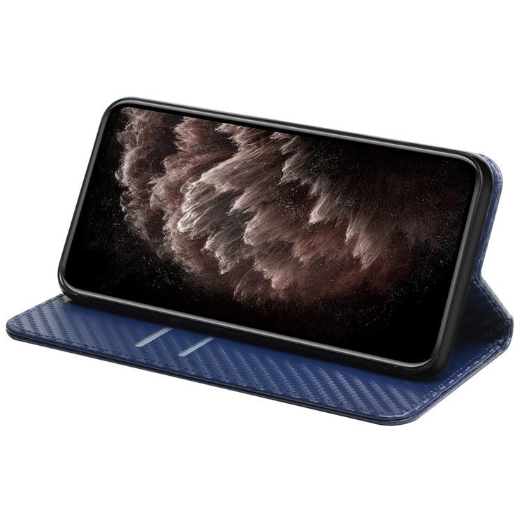 Carbon Fiber Texture PU Leather Case Auto Magnetic Closed Flip Stand Wallet Cover for Realme C21 - Blue