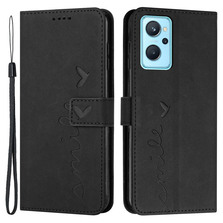 For Oppo A36/A76/K10 4G/Realme 9i Heart Shape Impact Resistant Imprinted Phone Case PU Leather Skin-touch Feeling Wallet Stand Feature Shell with Strap - Black