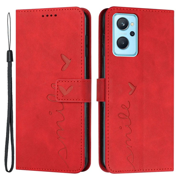 For Oppo A36/A76/K10 4G/Realme 9i Heart Shape Impact Resistant Imprinted Phone Case PU Leather Skin-touch Feeling Wallet Stand Feature Shell with Strap - Red