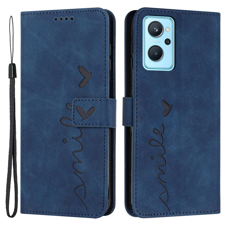 For Oppo A36/A76/K10 4G/Realme 9i Heart Shape Impact Resistant Imprinted Phone Case PU Leather Skin-touch Feeling Wallet Stand Feature Shell with Strap - Sapphire