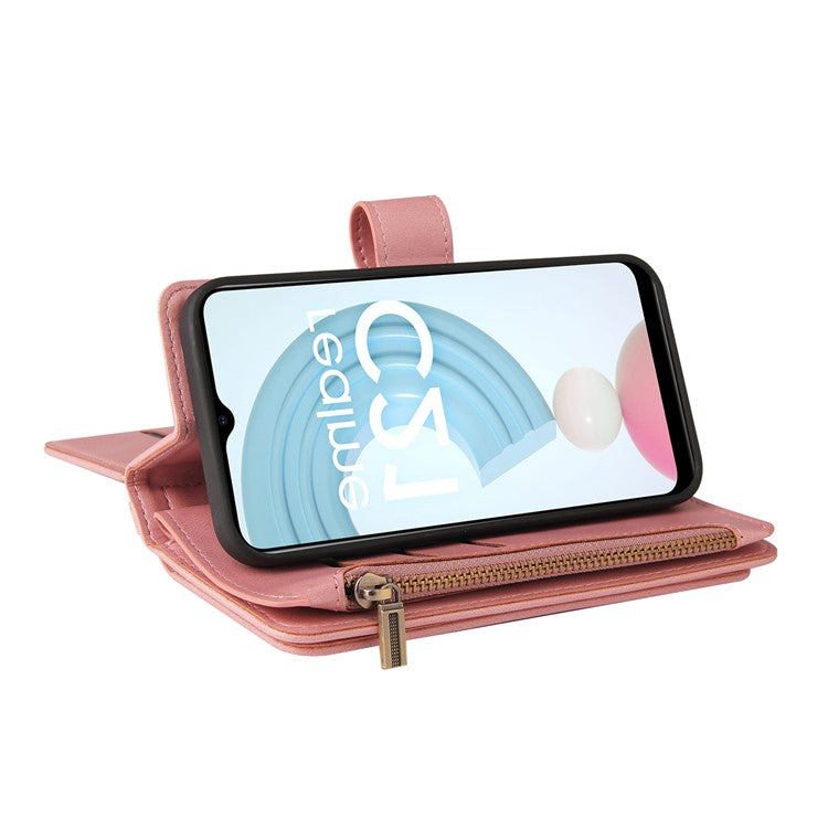 For Realme C21 KT Multi-functional Series-2 All-round Protection Skin-touch Feel Leather Wallet Stand Case with Multiple Card Slots and Zipper Pocket - Pink