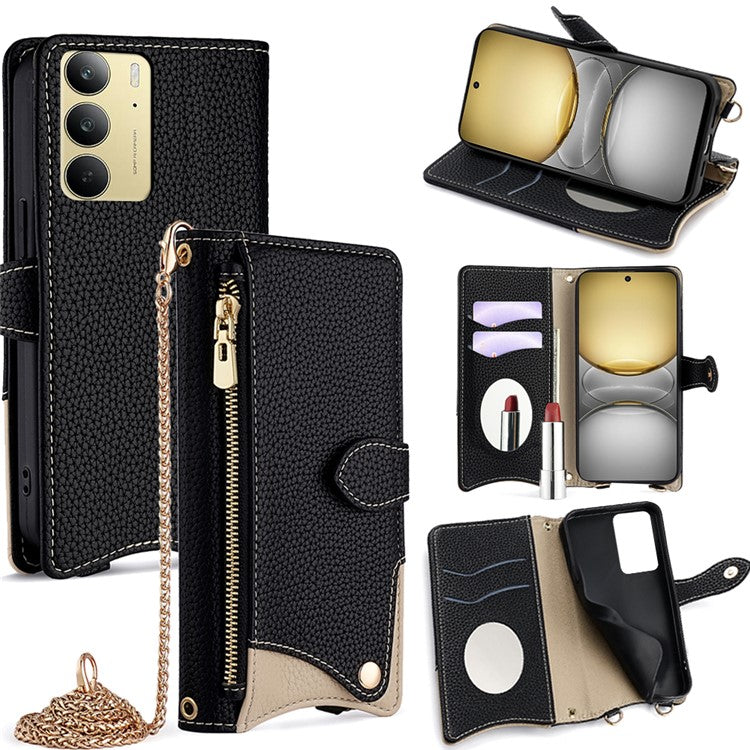 For Realme C75 / 14x 5G Wallet Case Fishtail Design Leather Phone Cover with Mirror / Stand / Strap - Black