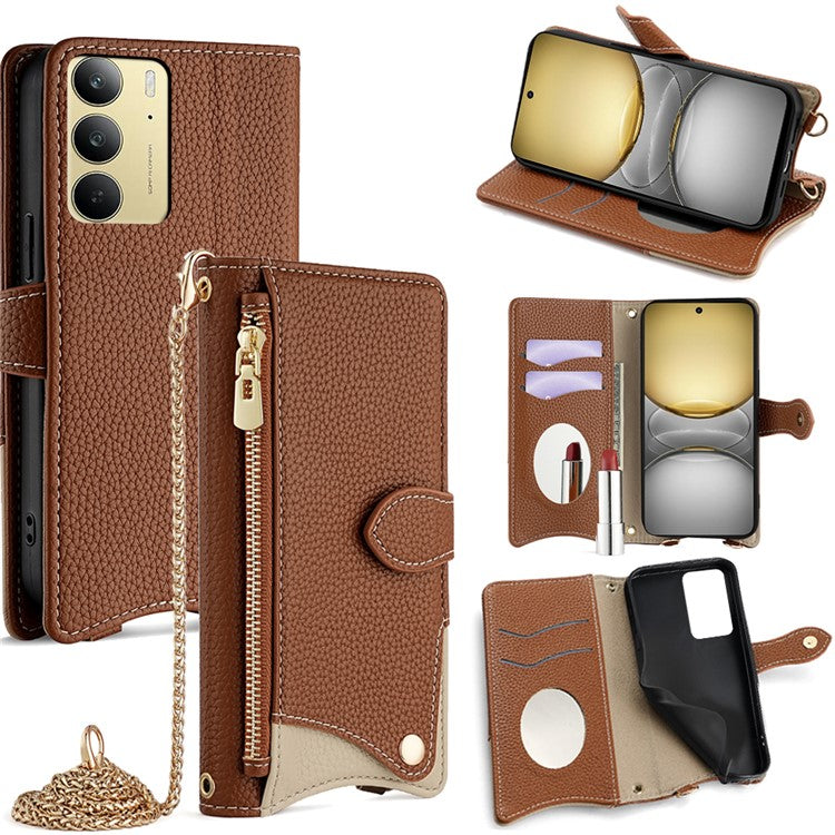 For Realme C75 / 14x 5G Wallet Case Fishtail Design Leather Phone Cover with Mirror / Stand / Strap - Brown