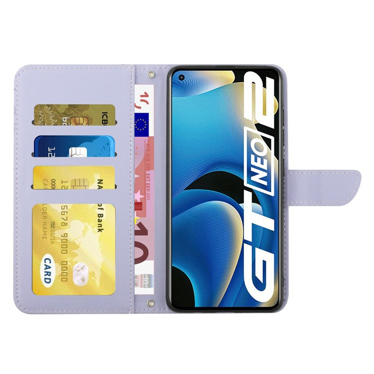 HT03 Shockproof Phone Case for Realme GT Neo2 5G / GT Neo 3T 5G, Skin-touch PU Leather Butterfly Flowers Imprinting Wallet Phone Cover Stand with Shoulder Strap - Light Purple