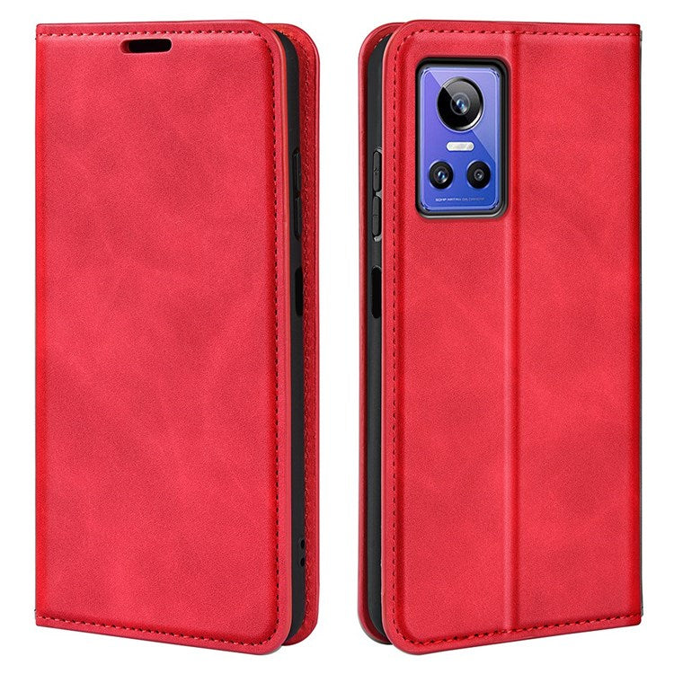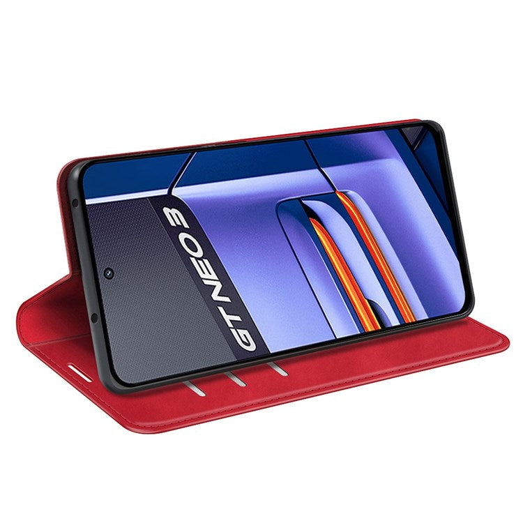 PU Leather Skin-touch Feeling Phone Case for Realme GT Neo3, Magnetic Auto-absorbed Wallet Stand Shell - Red