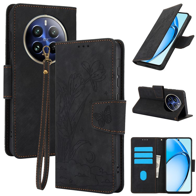 SY-001 For Realme 12 Pro 5G / 12 Pro+ 5G Case with Wrist Strap Butterfly Flower Leather Phone Cover Folio Wallet - Black