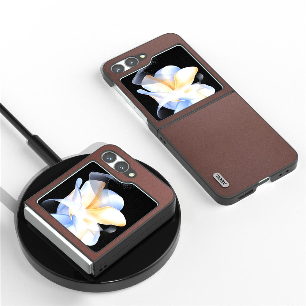 ABEEL For Samsung Galaxy Z Flip7 FE 5G / Z Flip6 5G Case Genuine Cow Leather Coated PC Folding Phone Cover - Coffee