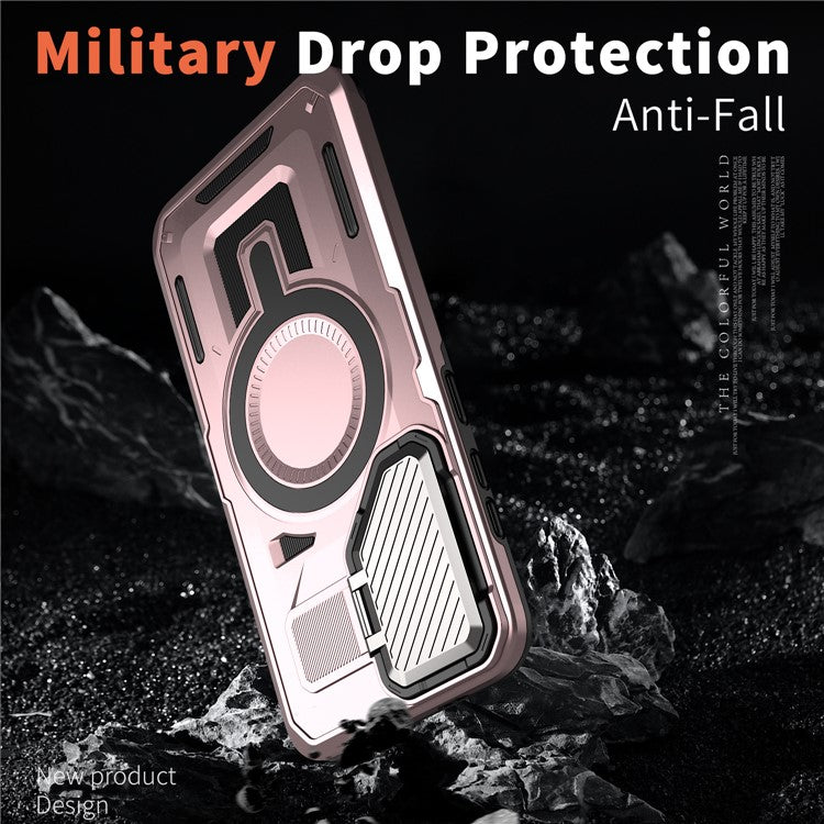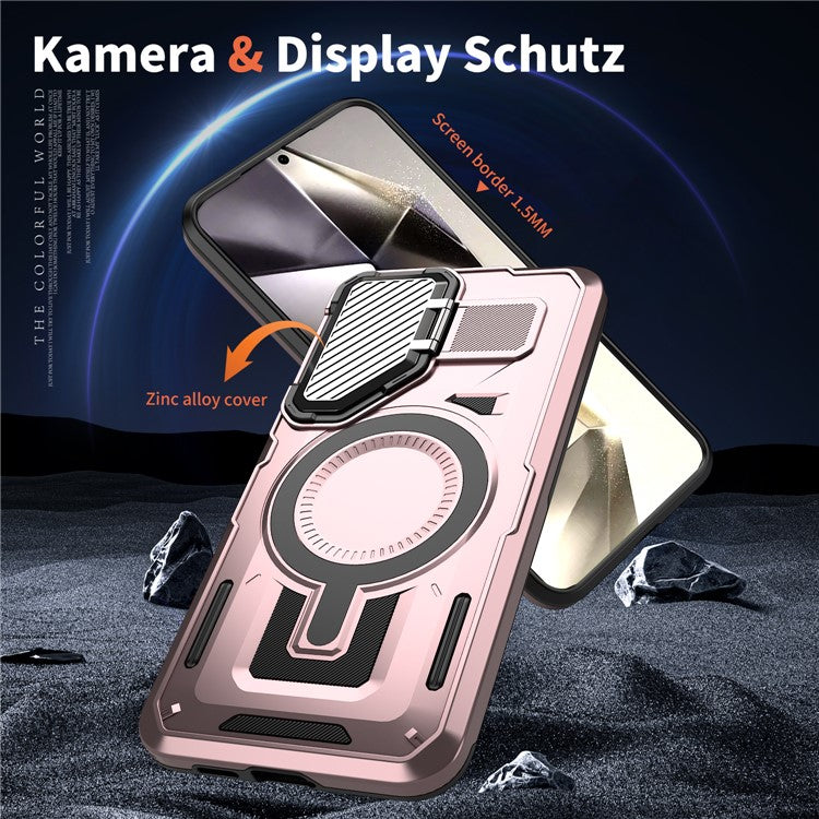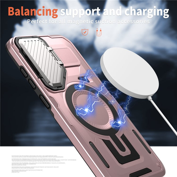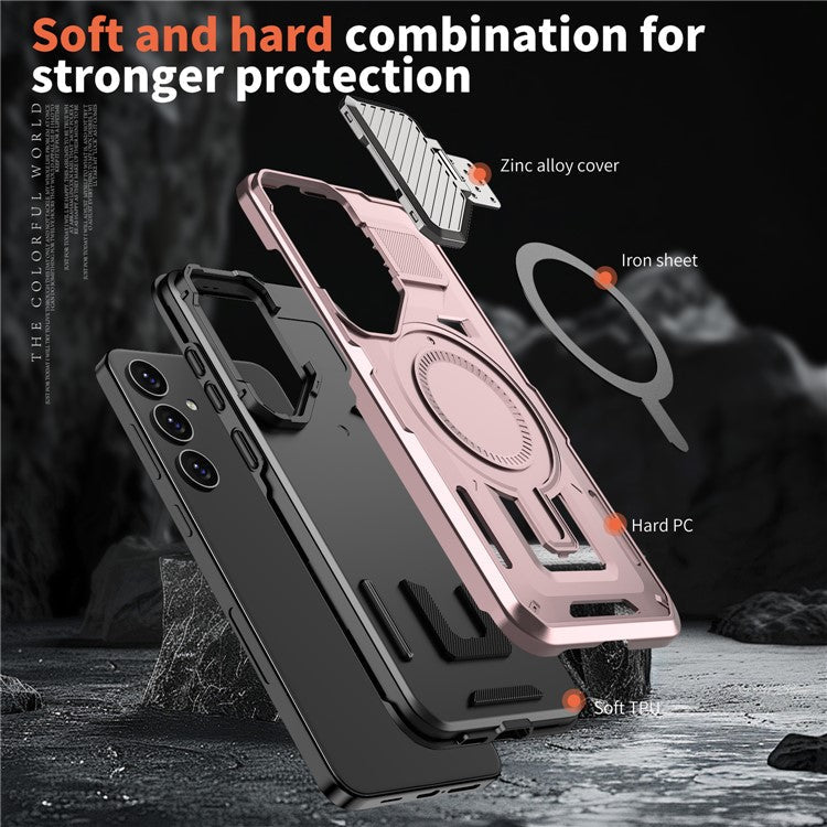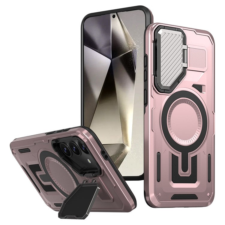 For Samsung Galaxy S24 FE Case Compatible with MagSafe Lens Lid Kickstand PC+TPU Back Cover - Rose Gold