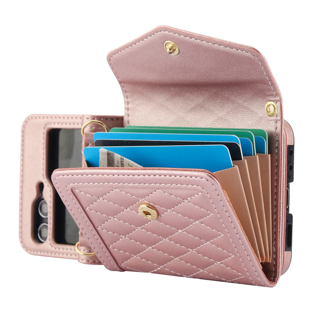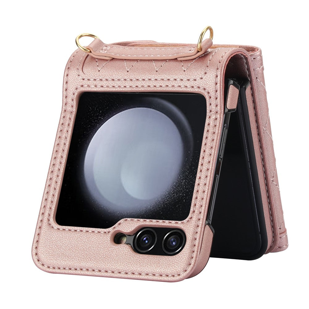 For Samsung Galaxy Z Flip7 FE 5G / Z Flip6 5G Case Card Holders PU Leather+PC Phone Cover with Detachable Shoulder Strap - Rose Gold