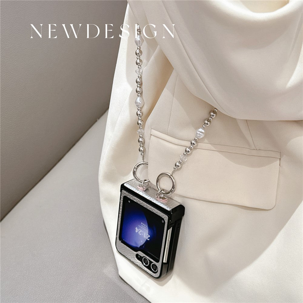 For Samsung Galaxy Z Flip7 FE 5G / Z Flip6 5G Case Hinge Protection Leather+PC Phone Cover with Crossbody Beaded Strap - Silver