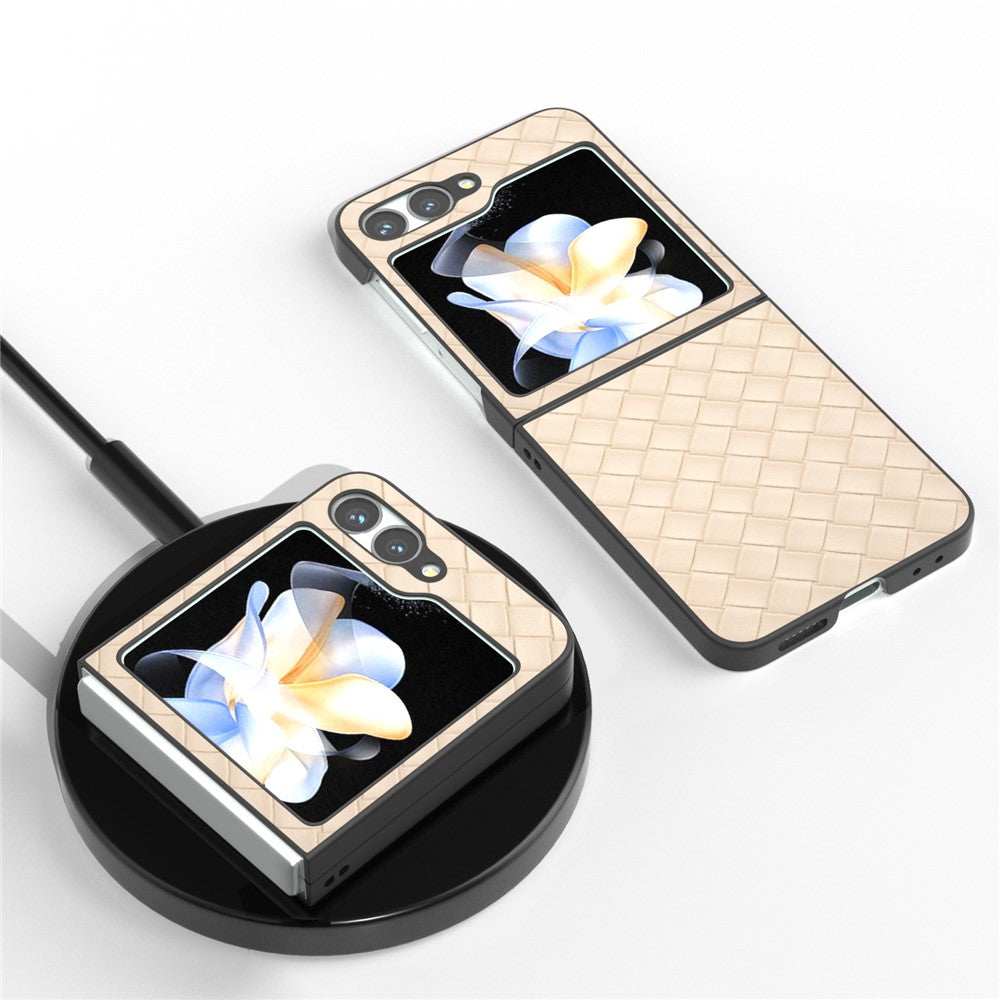 For Samsung Galaxy Z Flip7 FE 5G / Z Flip6 5G Case Woven Texture Leather+PC Protective Phone Cover - Beige