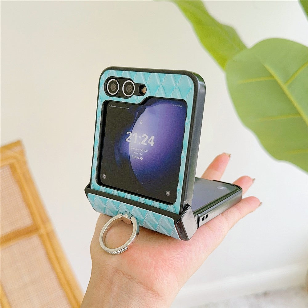 For Samsung Galaxy Z Flip7 FE 5G / Z Flip6 5G Rhombus Imprinted PU Leather Coated PC Phone Cover with Ring Kickstand - Baby Blue