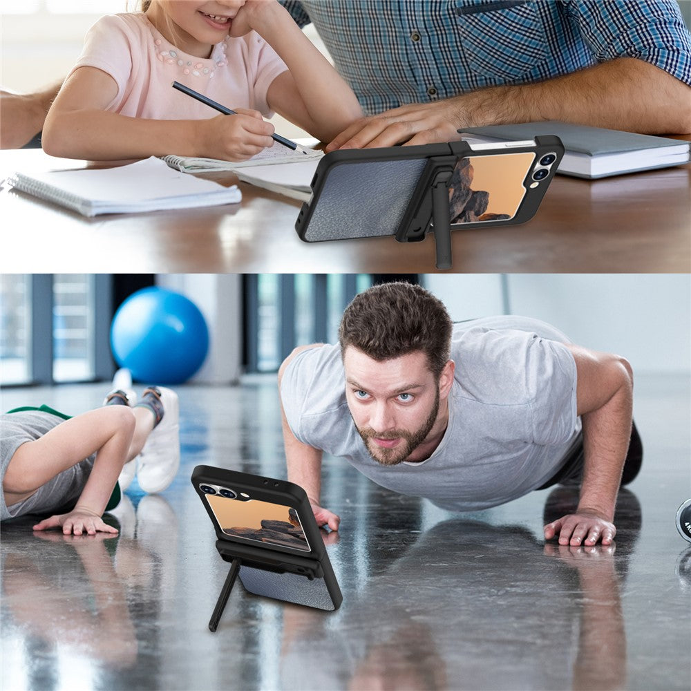 GW181 For Samsung Galaxy Z Flip7 FE 5G / Flip6 5G Kickstand Case Litchi Texture PU + PC Phone Back Cover - Grey Blue