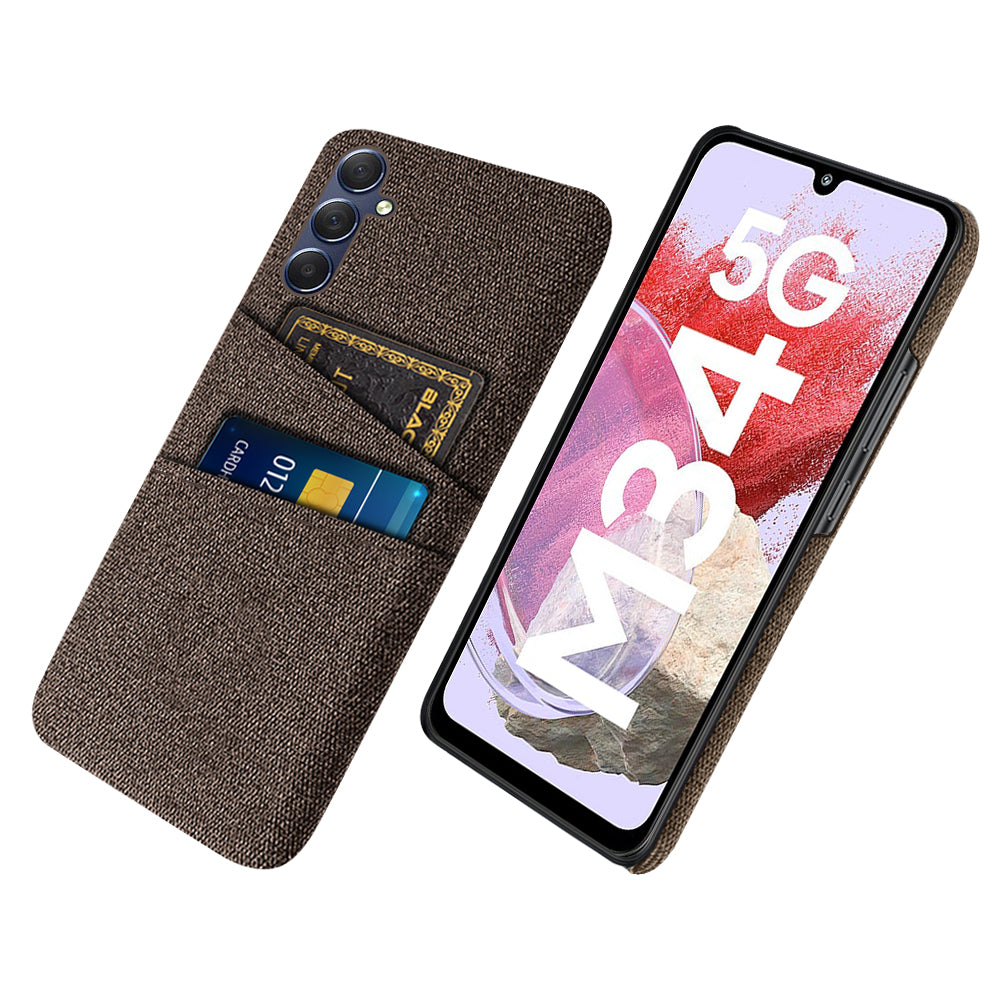 For Samsung Galaxy M34 5G / F34 5G Phone Cover Hard PC+Cloth Phone Case with Dual Card Holder - Brown