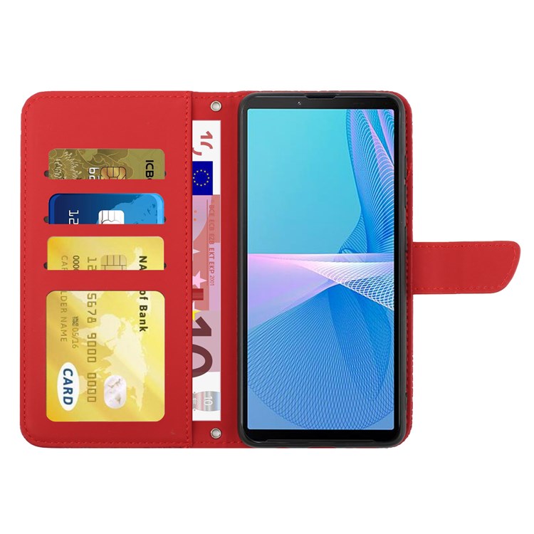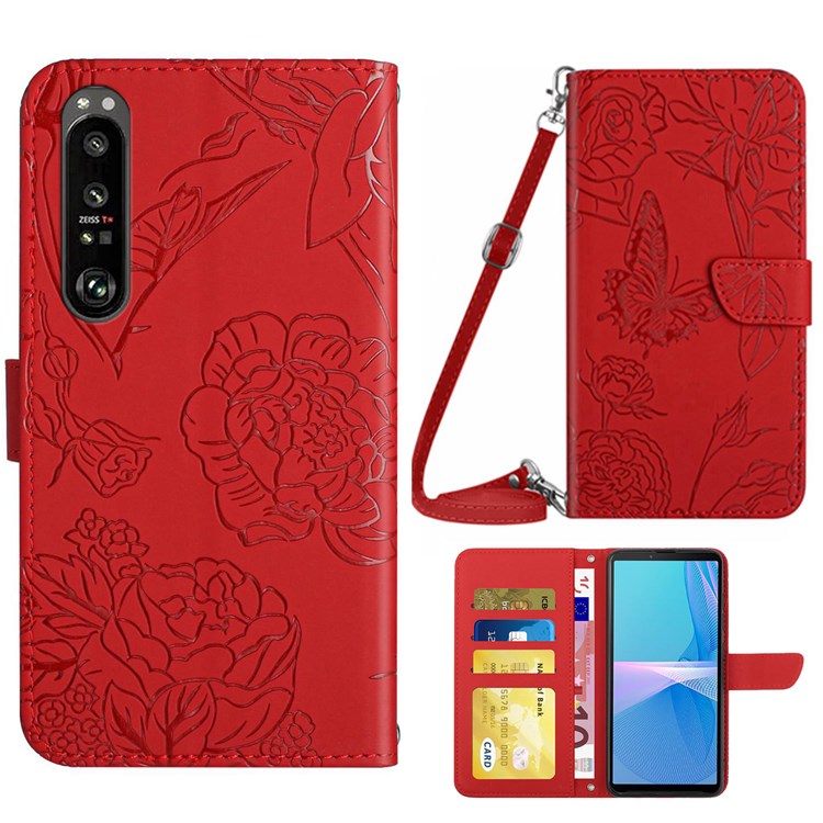 For Sony Xperia 1 III 5G Skin-touch PU Leather Phone Case Bag, Pattern Imprinting Design Hands-free Stand Wallet Cover with Shoulder Strap - Red