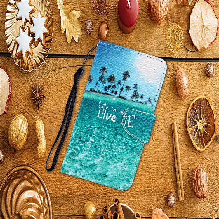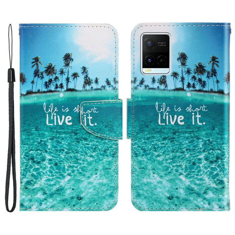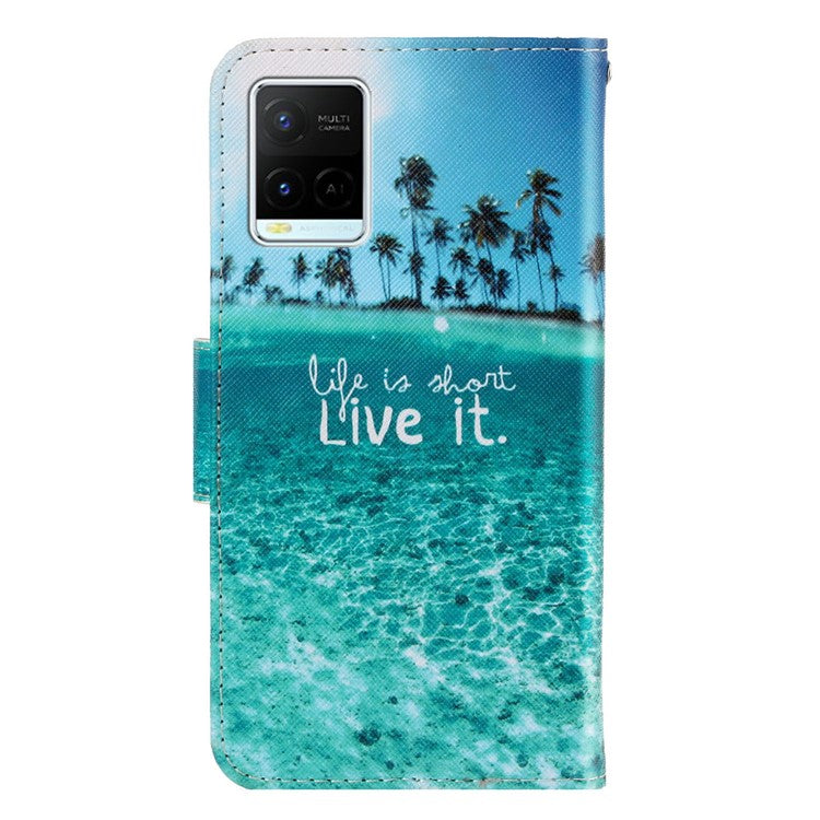 Anti-scratch Drop-proof Pattern Printing Case PU Leather Flip Wallet Cross Texture Stand Cover for vivo Y21/Y21s/Y33s - Seaside Time