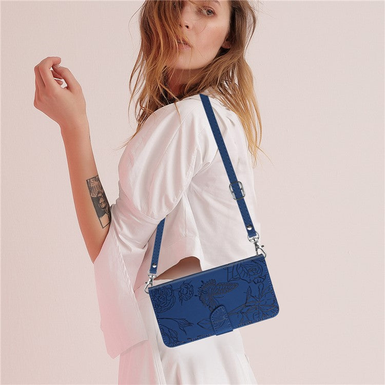 HT03 For vivo Y78+ 5G PU Leather Phone Cover Imprinted Flip Stand Wallet Case with Shoulder Strap - Blue