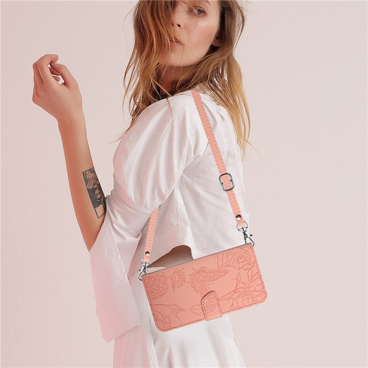 HT03 For vivo Y78+ 5G PU Leather Phone Cover Imprinted Flip Stand Wallet Case with Shoulder Strap - Pink