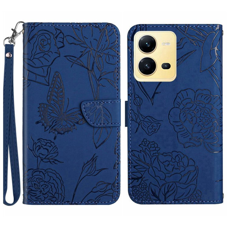 For vivo X80 Lite 5G / V25 5G HT03 Imprinted Butterfly Flowers Wallet Case Skin-touch PU Leather Magnetic Closure Flip Stand Cover with Strap - Blue
