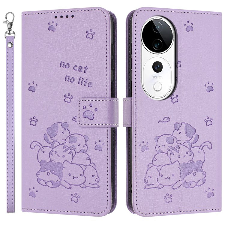 Phone Case for vivo T3 Ultra 5G / V40 5G / V40 Pro 5G / S19 Pro 5G Cats Imprint Leather Wallet Cover with Strap - Purple