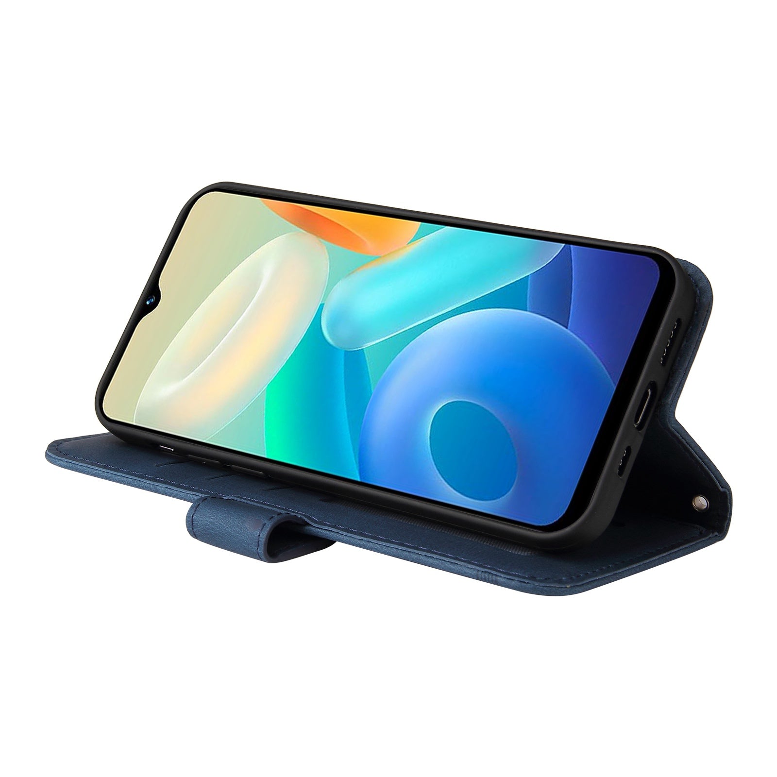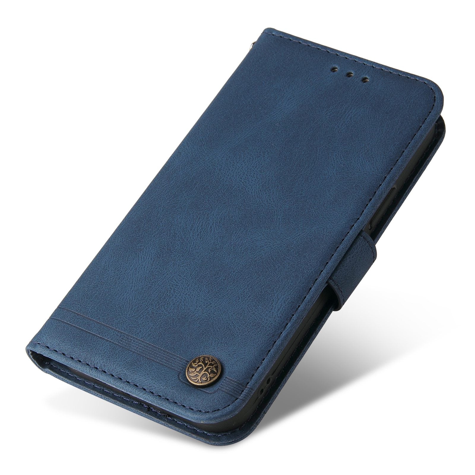For vivo Y02s 4G / Y16 4G Lines Imprinted Skin-touch PU Leather Wallet Case Tree Pattern Metal Button Stand Flip Shockproof Cover with Strap - Blue