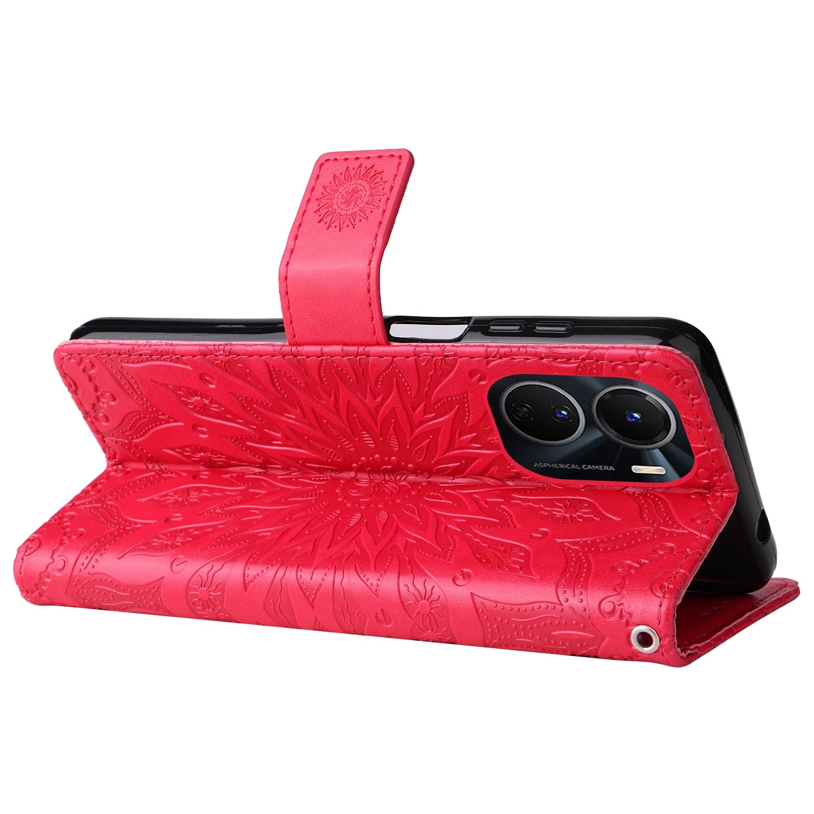 KT Imprinting Flower Series-1 for vivo Y16 4G / Y02s 4G Adjustable Stand Phone Wallet Cover  Sunflower Imprinted PU Leather Shockproof Phone Case - Red